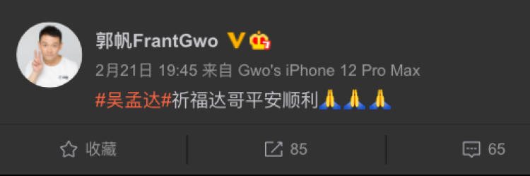 曾和吴孟达合作《流浪地球》的导演郭帆,在微博为吴孟达祈福。