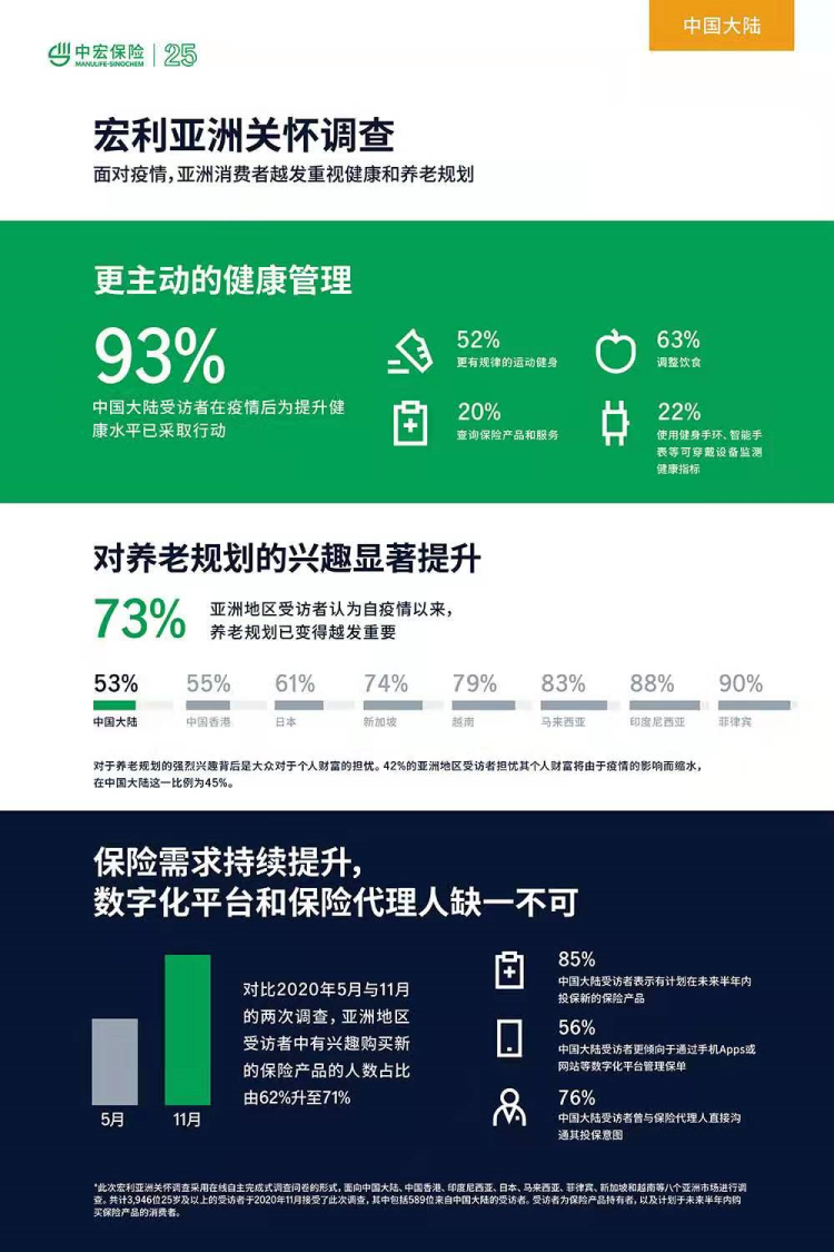 最新一期的“宏利亚洲关怀调查”(Manulife Asia Care Survey)进一步关注疫情下消费者的担忧、优先事项和未来期望。此次调查共收集了亚洲多个地区的保险产品持有者或计划未来半年内购买保险的4000位受访者的信息,其中包括来自中国大陆的590位受访者 。