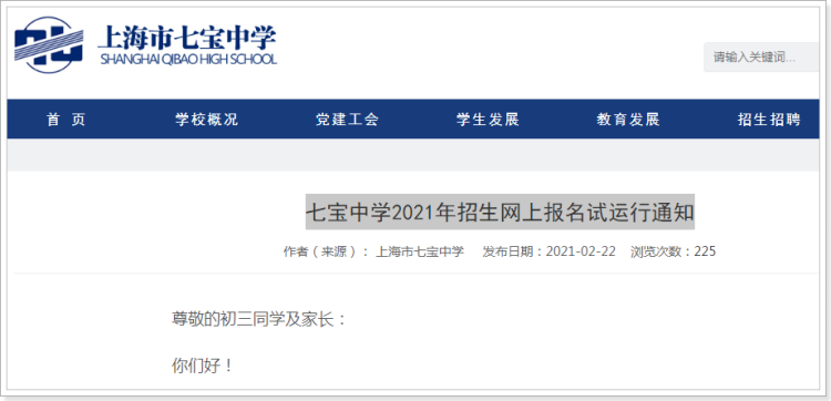 关注七宝中学自主招生动态的初三同学和家长注意啦!七宝中学2021年招生网上报名系统今日(2月22日)开始试运行。