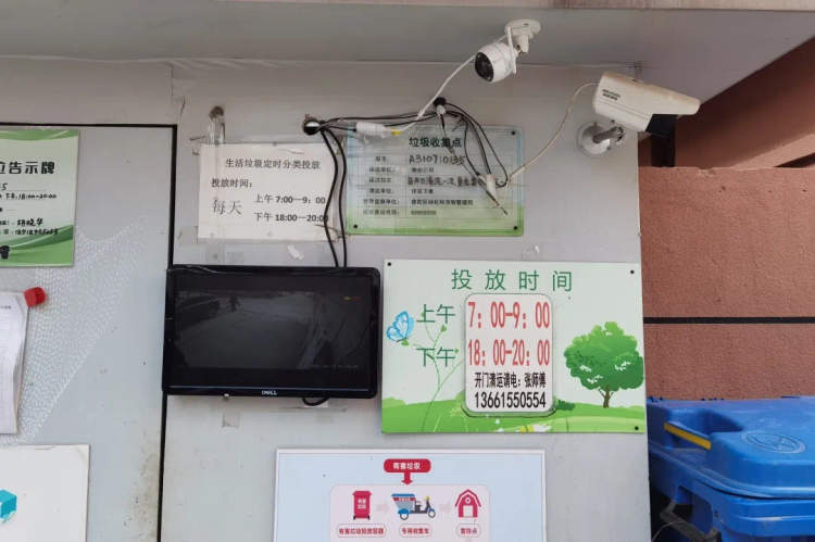 这一想法得到了在场所有人的认可。没过几天,摄像头、显示器及自动语音播报器这一套设备便出现在了小区的垃圾分类投放点,正式开始“试运行”。居民区决定,以南李苑843弄一期作为试点,在垃圾分类投放点安装监控感应设备,只要有人在非开放时段内投放垃圾,就会被监控设备录像,同时相关提示语音也同步开始播放,提醒居民规范投放垃圾。而值得一提的是,该语音播报器为全自动智能化设备,不需要人为操作,可自主设置时间,确保每天夜间10点之后停止播报,不影响居民的正常休息。