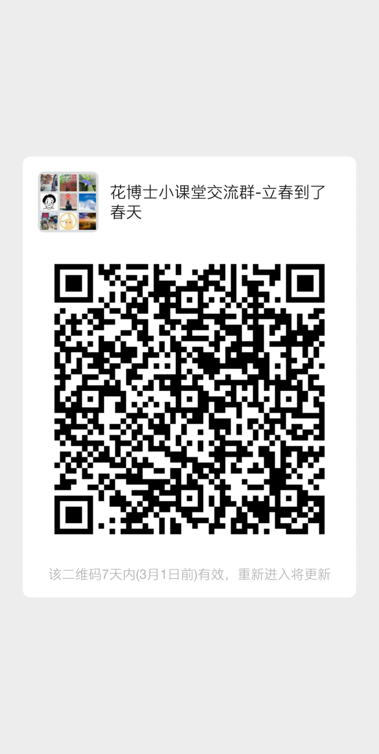 更多照顾花卉的小知识和花友的互动,欢迎微信扫码加入“花博士小课堂交流群”哦↓