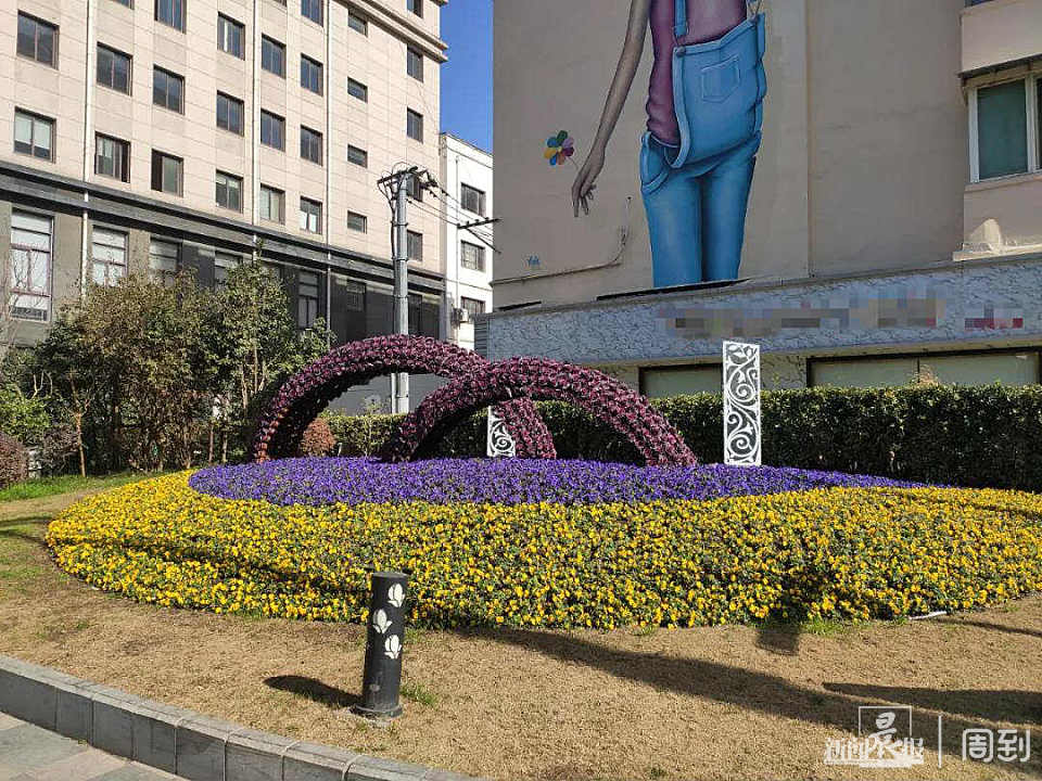 五角场核心区的黄兴路、淞沪路“两片”中,有10根直径1米、高度4.5米的立体花柱。那一带新种植了角堇(黄色)和火焰南天竹,黄色角堇与红色树皮覆盖物在花坛勾勒出12块“金牛”造型图案,寓意“牛气冲天”。