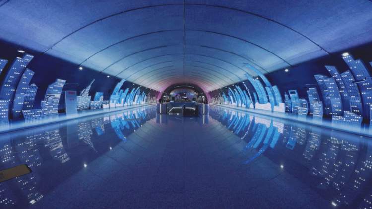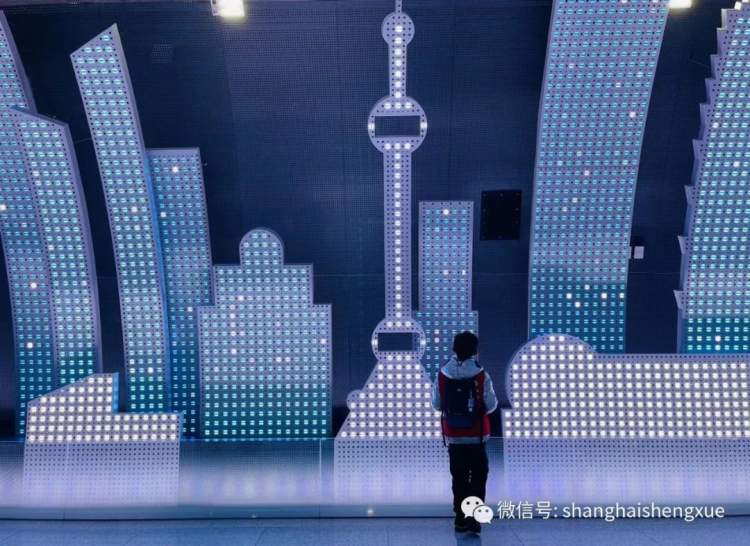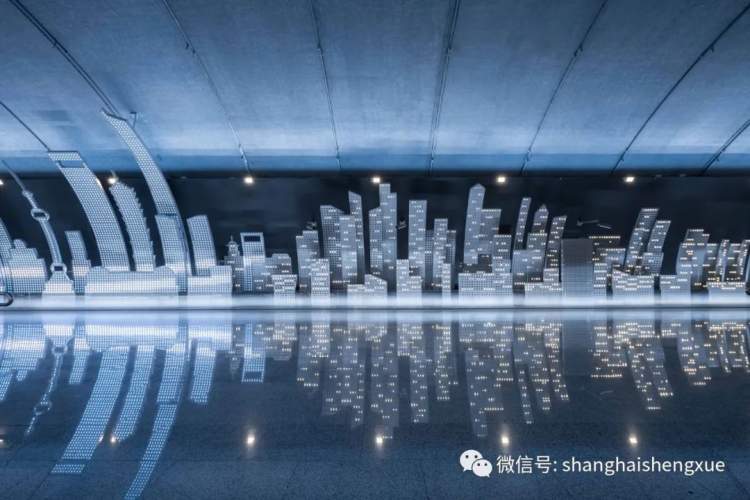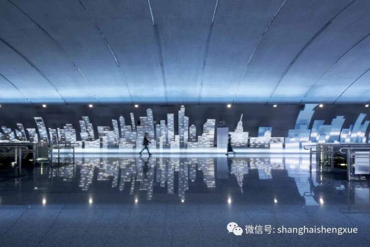 当我走进地铁站时,被整个大厅深深吸引。大厅的两侧,是用无数LED灯组成的上海天际线,由蓝白灰三色组成,灰色代表即将降临的夜幕,白色便是万家灯火,蓝色又像是外滩高楼发出的绚丽光芒。更为神奇的是,遇到节日,上面的灯光还会变色,就像孩子们为节日盛装打扮一样。