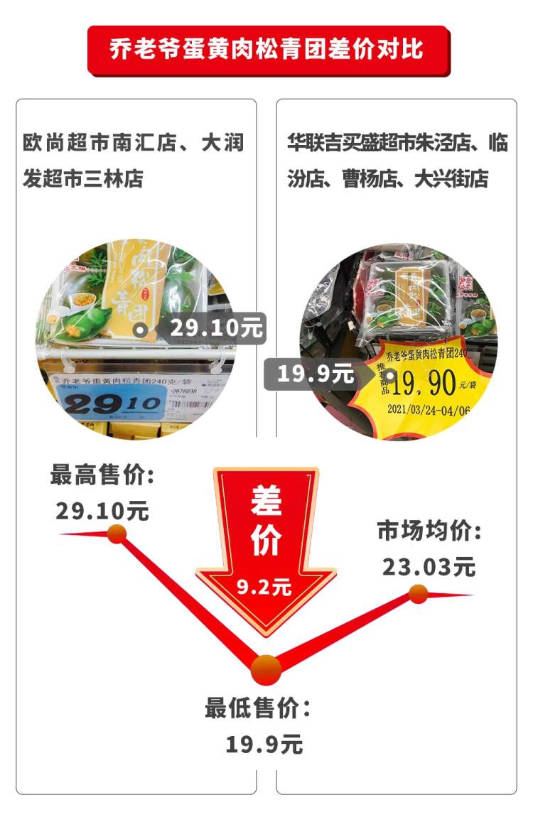 令人惊讶的是,监测到的青团最大价差竟达9.2元。价差为9.2元的青团是乔老爷蛋黄肉松青团(240克/4粒),欧尚超市南汇店、大润发超市三林店售价为29.10元;华联吉买盛超市朱泾店、临汾店、曹杨店、大兴街店售价为19.90元,两者相差9.2元。