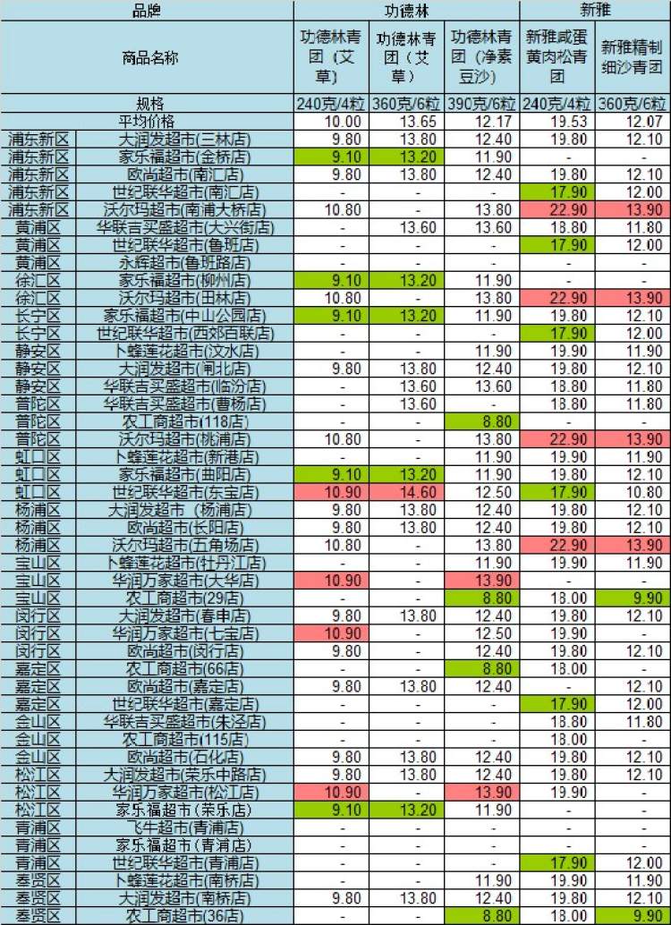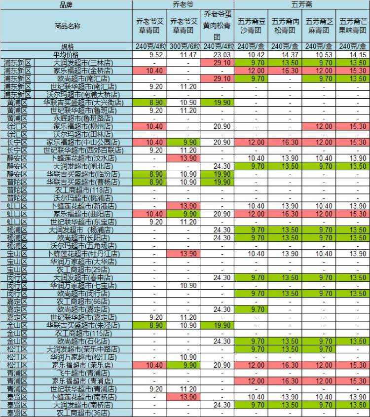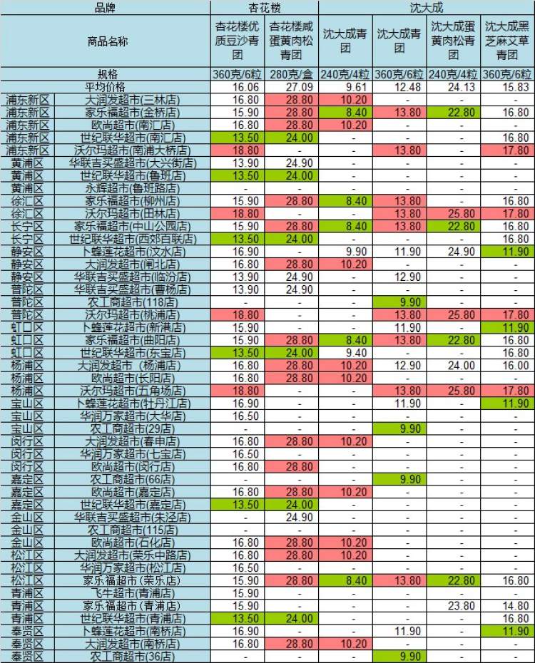 市价监成调队昨日公布了沪上45家超市部分青团价格,包括杏花楼、沈大成、功德林、新雅、乔老爷、五芳斋等6家知名青团品牌。