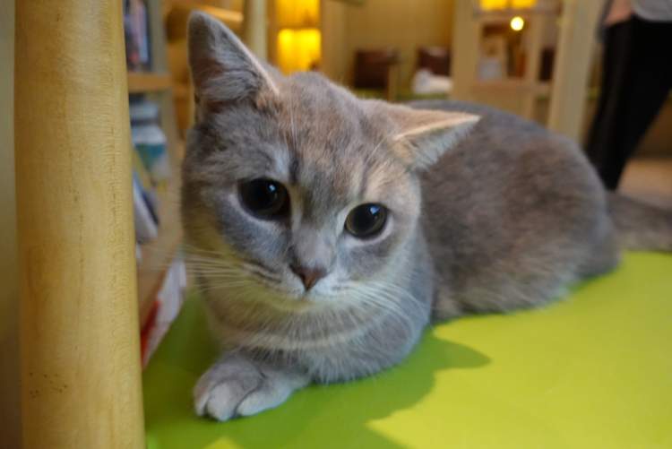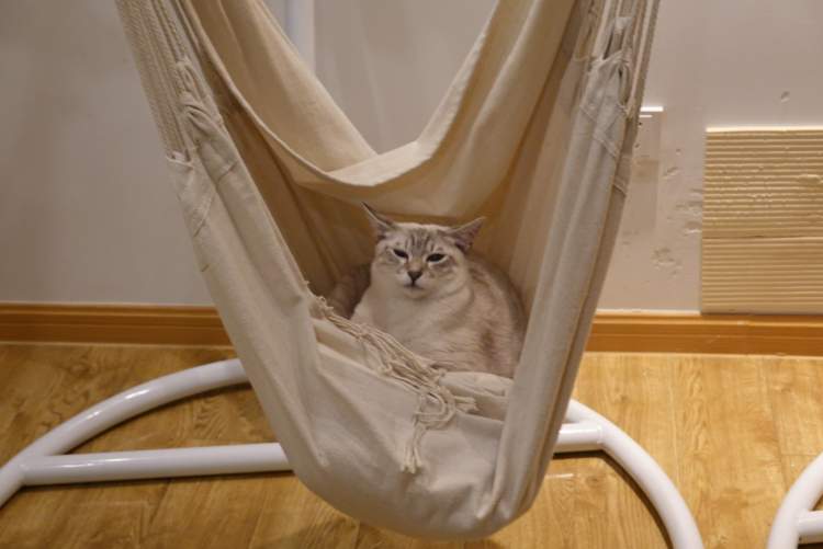 如果你在店里看到了一只爱荡秋千的猫,不要怀疑,它有极大的概率是蓝虎斑暹罗猫RIVER。从左数过来第二个秋千是它的专座,平日里睡得一脸慵懒,但是如果你拍拍它,握握手,它都会非常乐意。