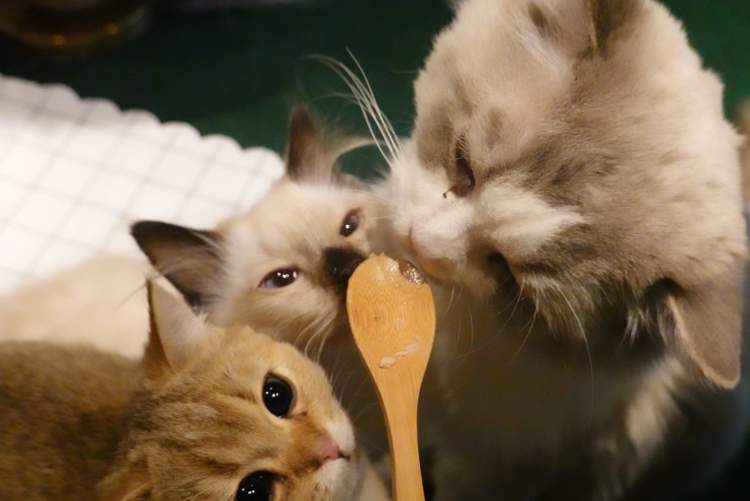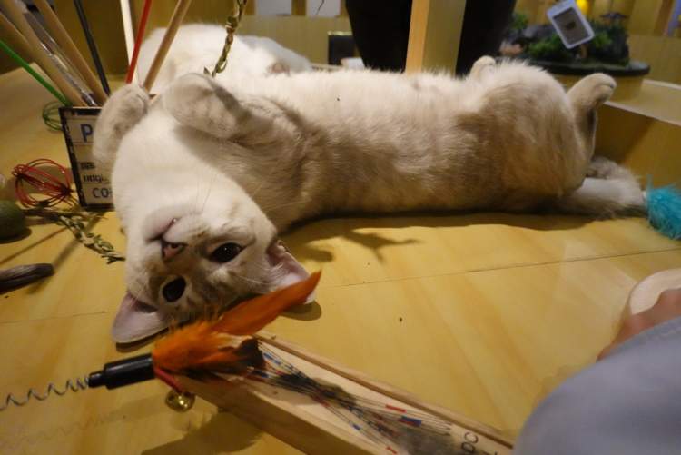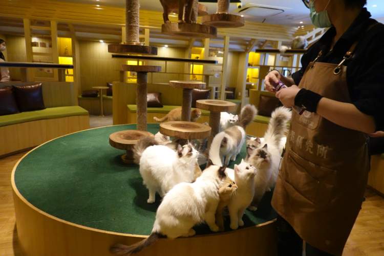 和猫培养感情的好办法是喂零食。为了防止猫咪吃撑,店家每天限量供应10份小零食,一份20元。喂食的时辰,可谓是“猫情沸腾”“万猫空巷”了!