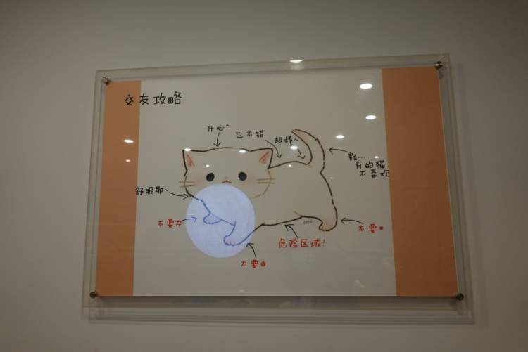 当然,猫猫之所以会进入到人类的世界,还因为我们是互相需要的。如果你需要猫咪给予的治愈,可以学习一下店内提供的从步骤到部位的“撸猫指南”,先让猫闻你的气味,再摸它喜欢的地方,最后,有的猫是可以抱起来的——但是你不能强制。
