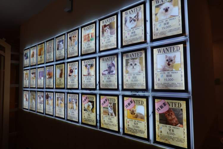 大多数猫有缘即可带回家。一整面墙都是海贼王样式的“通缉令”海报,标示了猫咪的名字、种类、性格、售价等信息。