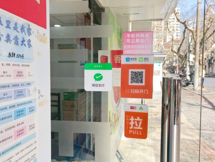 便利店门上贴有二维码,晚间顾客可用手机微信或支付宝扫码,通过绑定手机号码完成注册,大门就会自动打开。