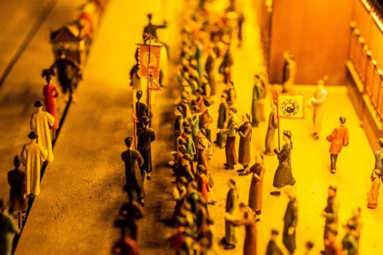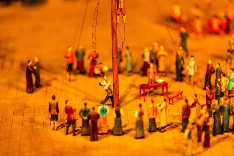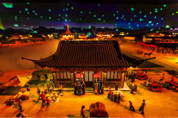 进入海上遇园展厅,一个6×13米的大型沙盘放置其中,相当于一辆公交车的身长!在此之上呈现的是以1:30比例还原的豫园、城隍庙片区的市井百态和民俗全景。其平面结构参考了1784年乾隆时期的《邑庙西园图》等资料。亭台楼阁,巷陌街弄,还有其间的3000多位小人儿,组成了实物版的《清明上河图》。