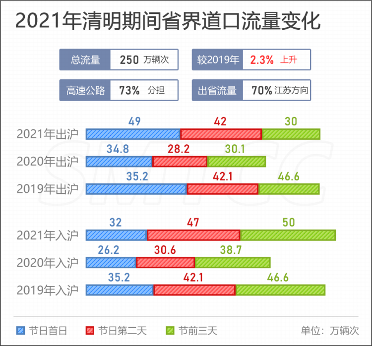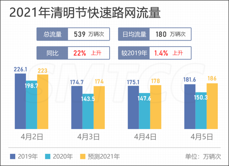 节前一天(4月2日),由于提前扫墓、踏青出游与工作日通勤出行相互叠加,预计下午至晚间,G40沪陕高速及长江隧桥、G1503高东入口、G2江桥、G50徐泾、G60新桥主线等部分高速公路出城方向流量将较为集中。