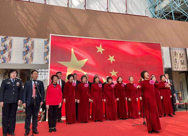 党员代表“全国最美志愿者”张心亚、“全国劳动模范”殷仁俊和“中国好人榜助人为乐好人”董瑞带领全场齐唱国歌。