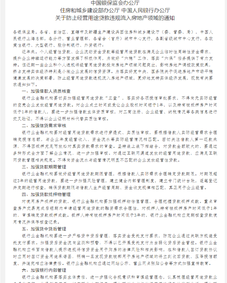 今天,银保监会办公厅、住房和城乡建设部办公厅、中国人民银行办公厅发布关于防止经营用途贷款违规流入房地产领域的通知。