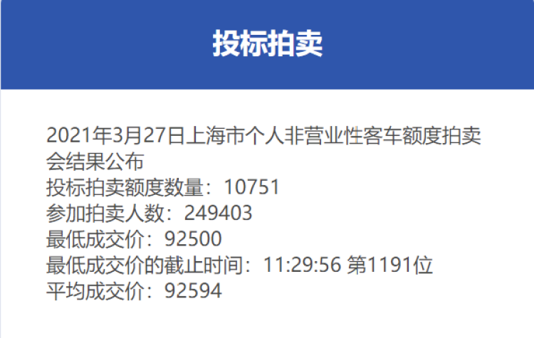 3月沪牌拍卖结果刚刚出炉:个人额度投放10000辆,个人在用车有效额度委托拍卖751辆,合计拍卖总数10751辆,参加拍卖人数249403人,比上月增加7037人,中标率4.3%。最低成交价92500元,平均成交价为92594元,比上个月的91719元增加了875元。最低成交价的截止时间是11:29:56第1191位。