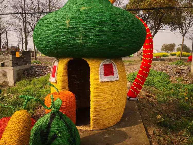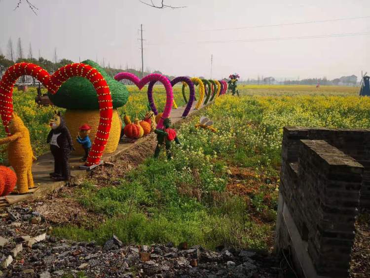 在300亩五彩油菜田中央,布置了长长的景观道,沿着景观道慢慢前行,穿过一道道五彩花环可以近距离欣赏油菜花景色。放置在田间的昆虫、牛羊、拖拉机等小摆设,特别有童趣和情调,让游客感觉置身于繁忙的农事中。