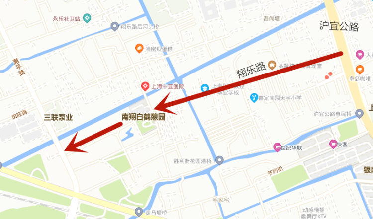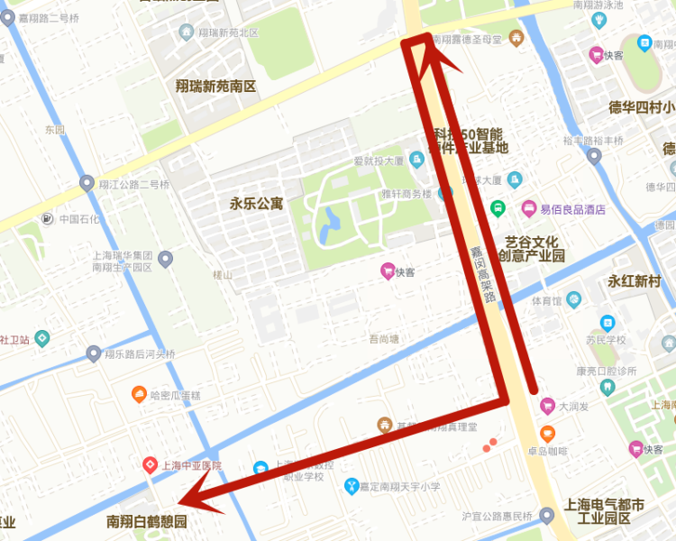 市区及虹桥地区:嘉闵高架真南路下匝道—沪宜翔江路口顺车调头—沪宜公路—翔乐路