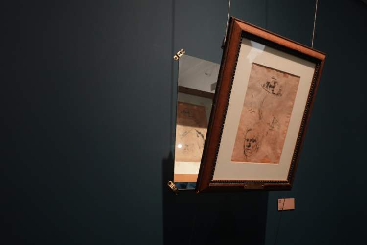 展厅里还有几幅被“挂”起来的作品,并非没有放好,而是为了同时展现正反面的画面。比如说这一幅的正面是肖像手稿,背面是人体足部手稿。