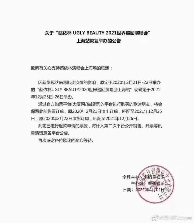 蔡依林这场演唱会原计划于去年2月举行,受疫情影响延期至今年12月25日、26日举行。