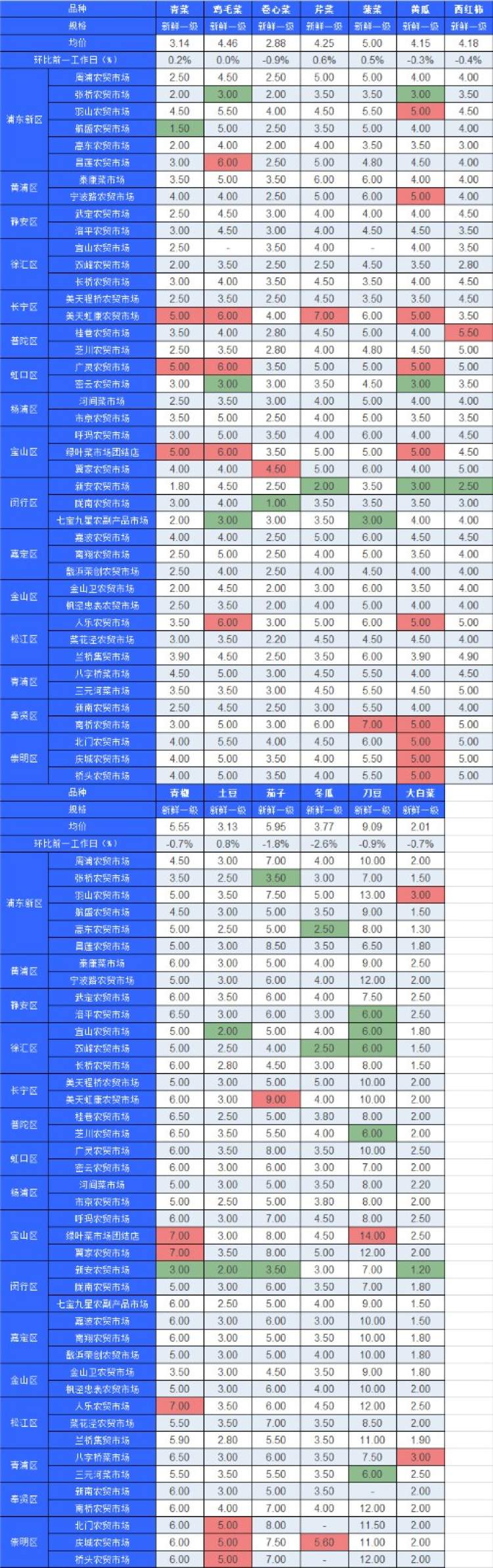 ■粉底标注代表该蔬菜品种在上述农贸市场或超市的最高价;绿底标注代表该蔬菜品种在上述农贸市场或超市的最低价