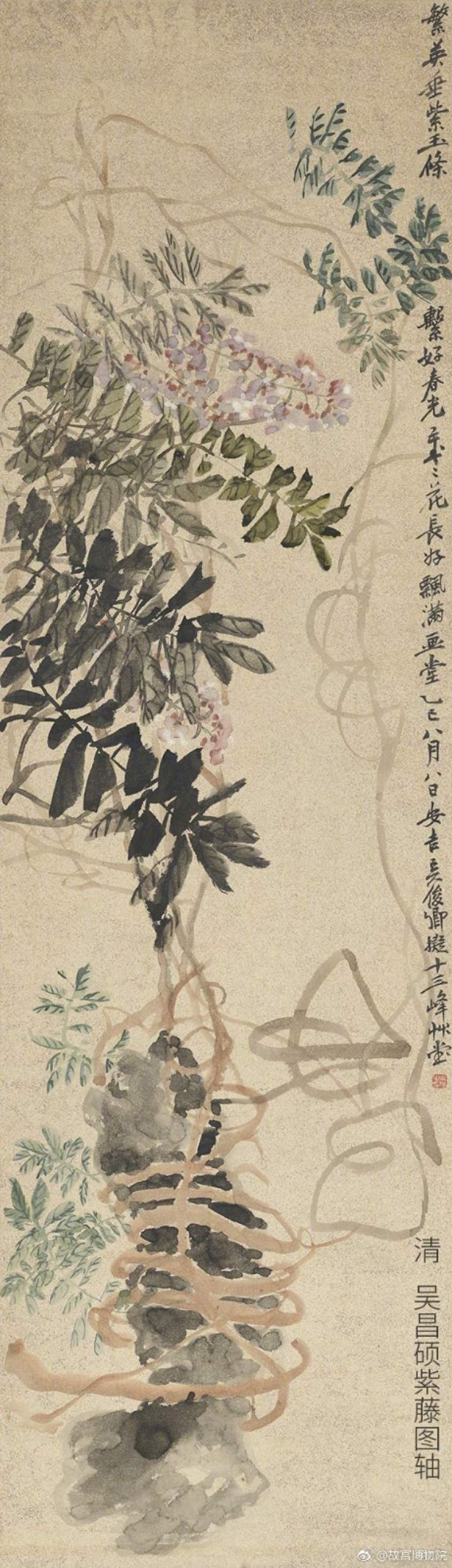 国画家也喜欢画紫藤,吴昌硕的紫藤金石入画,齐白石的紫藤谐趣生动。吴昌硕还曾自题紫藤图轴:“繁英垂紫玉,条系好春光。岁岁花长好,飘飘满画堂”。