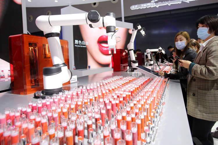 玛丽黛佳工艺工程师闫朔告诉记者,在上交会现场他们暂时选取了3款颜色可供观众挑选体验。口红胶囊进入定制仪后,机器人会再抓取一支口红外壳放入旁边的另一个入口,“设备会先把胶囊里的液体融化并灌装进口红管体,经过冷冻成型后,再由机械臂将管体取出并进行包装。”