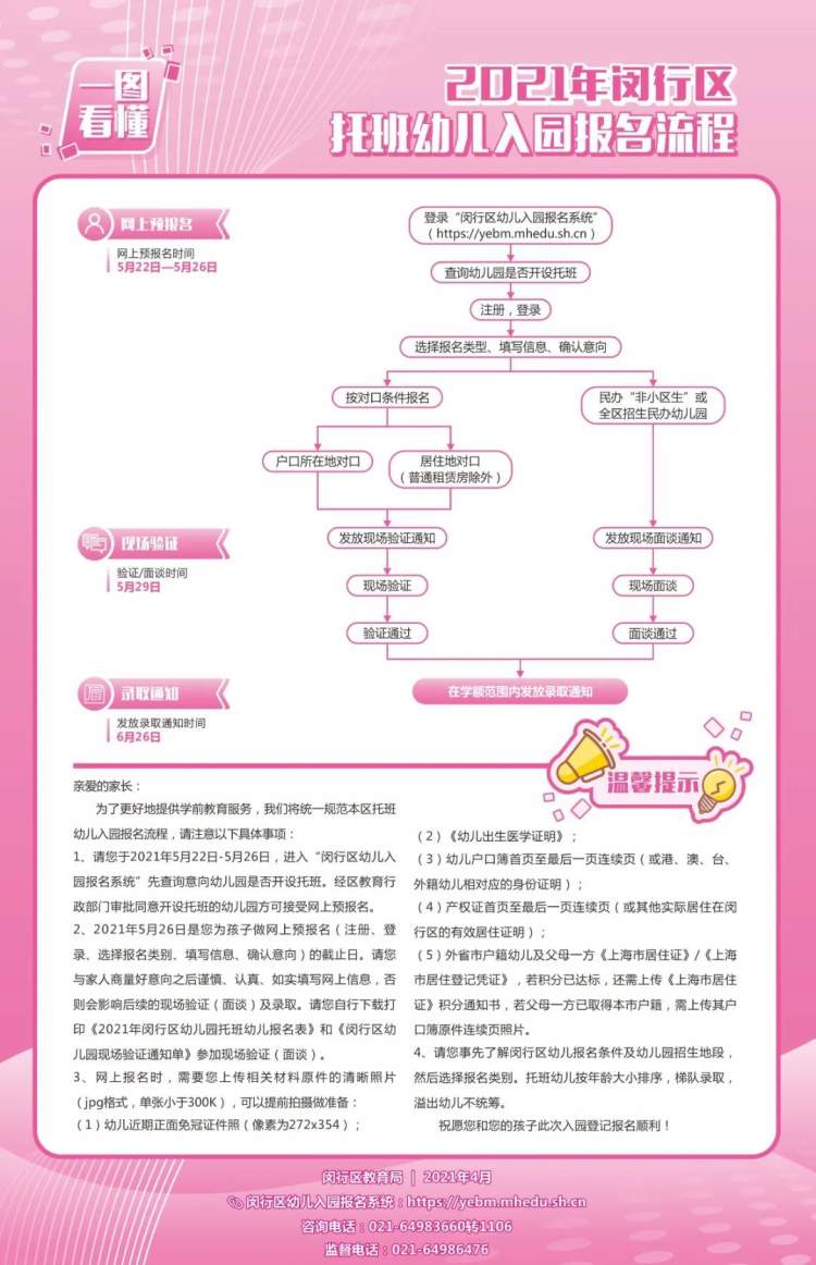 5月28日,网上预报名成功的适龄幼儿监护人,登录区报名系统查询现场验证相关信息,并下载打印《闵行区幼儿园现场验证通知单》及《2021年闵行区幼儿园托班幼儿报名表》。