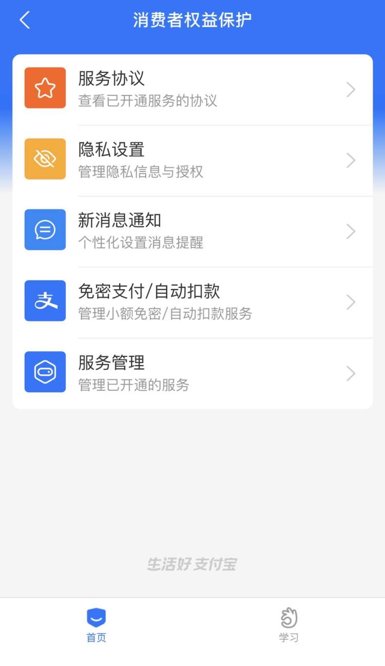 在“服务协议”一栏,可一键查看已开通服务的协议,优先上线“支付宝注册相关协议“、花呗以及借呗专区展示。
