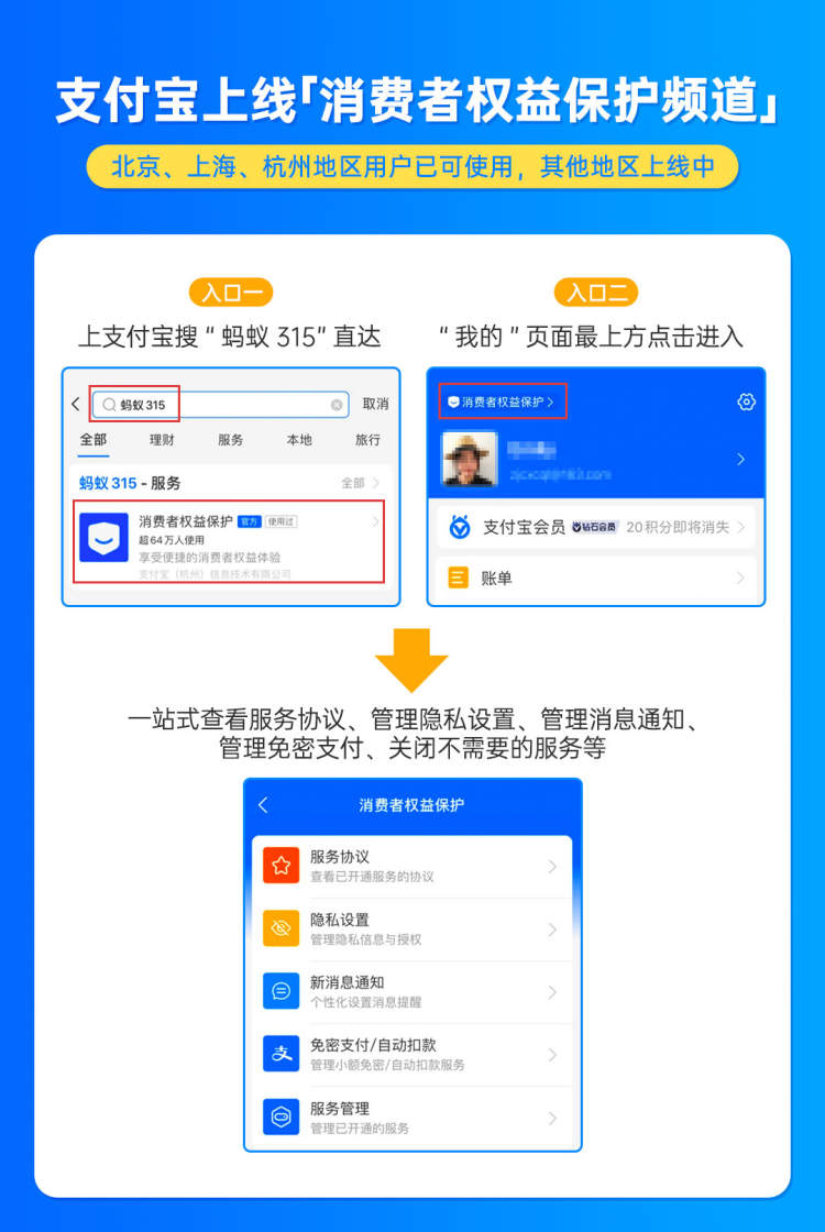 当前,频道正在试点期间,下一步将继续针对隐私保护、第三方免密扣款管理等进一步迭代。目前,消费者上支付宝搜“蚂蚁315”、“315”、“消费者权益保护”等都可进入消保频道,进行相应设置。