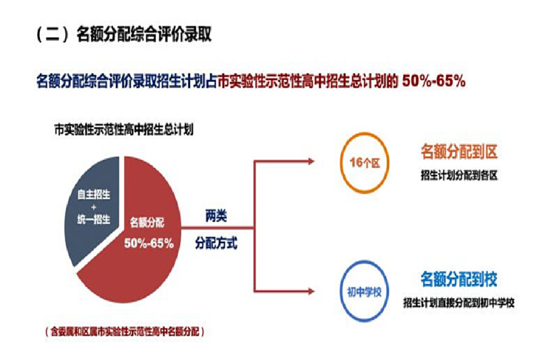区属市实验性示范性高中名额分配:区属市实验性示范性高中的名额分配招生计划占其招生计划总数的50-65%,其中,分配到区招生计划约占本校名额分配招生计划的30%,分配到校招生计划约占本校名额分配招生计划的70%。