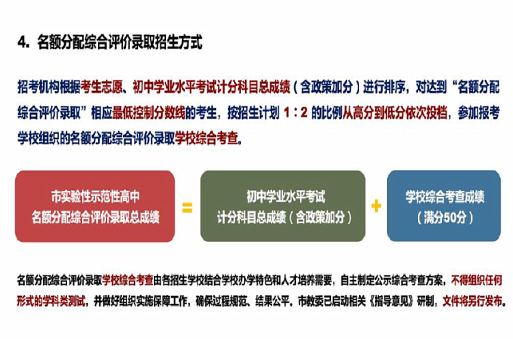 实施名额分配综合评价录取改革后,招考机构将考生计分科目总成绩和综合考查成绩(满分50分,具体办法另行颁布)合成总分。主要考查初中学生综合素质评价《纪实报告》的完成情况和学生综合素质发展情况。同时,将通过全程录像、双盲匹配等保障制度,确保考查过程和结果公平公正。