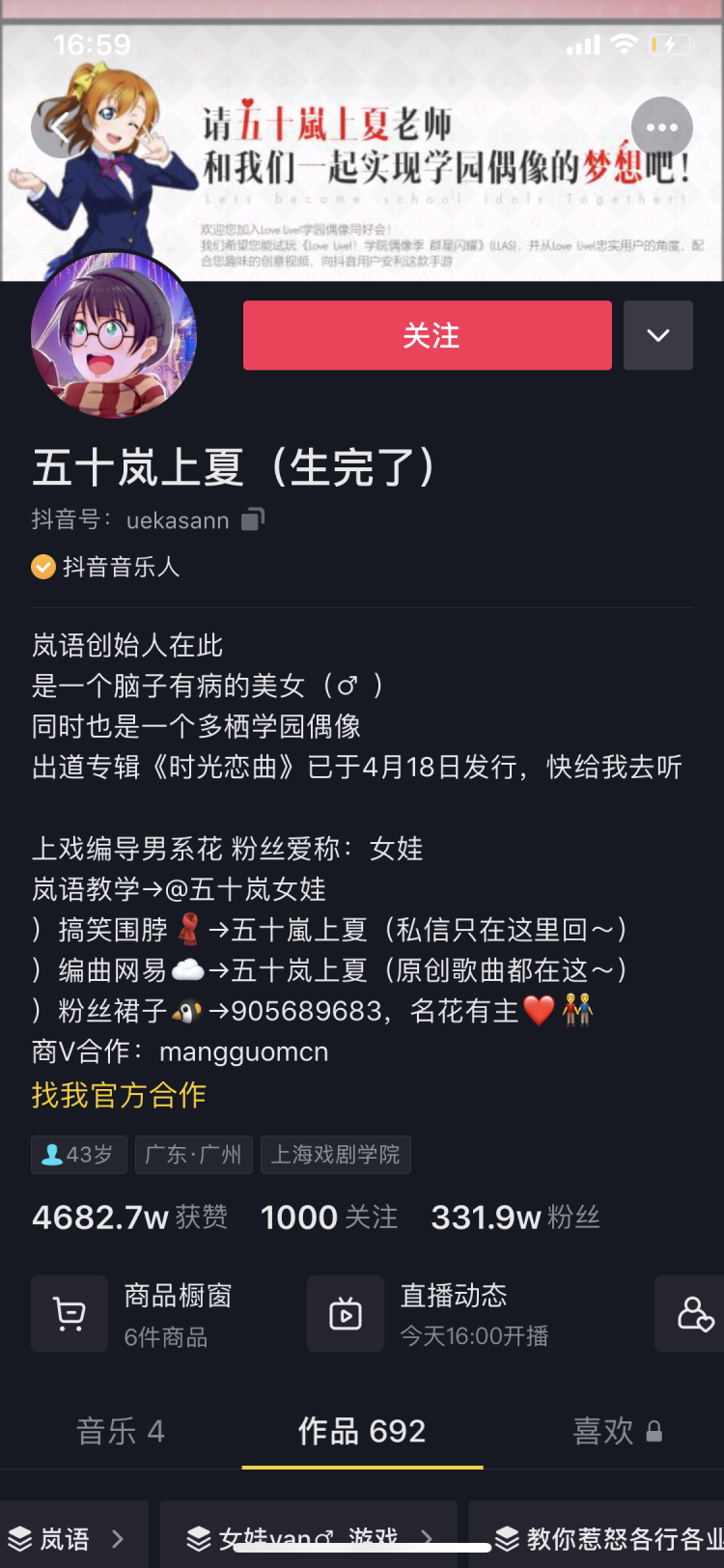 那“岚语”究竟是谁创造的呢?一个自称脑子有病的“美女”、同时也是一个多栖学园偶像、更是在抖音上拥有332万粉丝的博主“五十岚上夏”,他总是带着一副圆框大眼镜,把自己变身成各种风格的“女性”装扮,讲起岚语的时候,整个五官都在表达自信又魔性的风格。