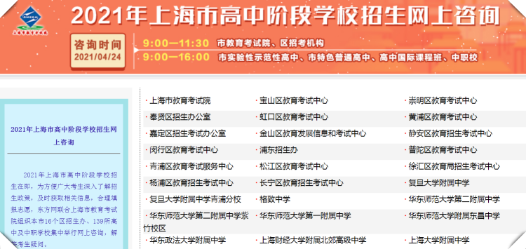 由上海市教育考试院主办、东方网协办的“2021年上海市高中阶段学校招生网上咨询活动”,将于本周六(4月24日)举行。