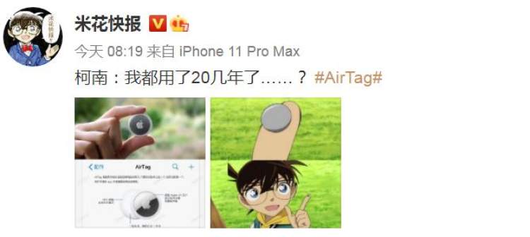 虽然苹果这款定位追踪器看似很有新意,但脑洞大开的网友还是不禁联到了《名侦探柯南》里阿笠博士给柯南做的定位器↓