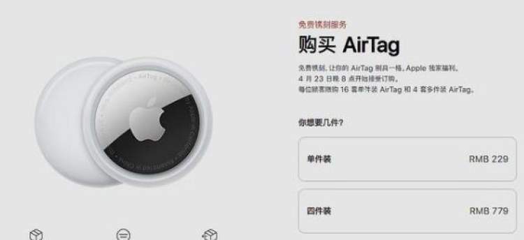 AirTag电池可以用一年多时间,不用充电,防泼溅。AirTag国行版单个售价为229元,AirTag四件装售价为779元(每件约合 195 元) 。
