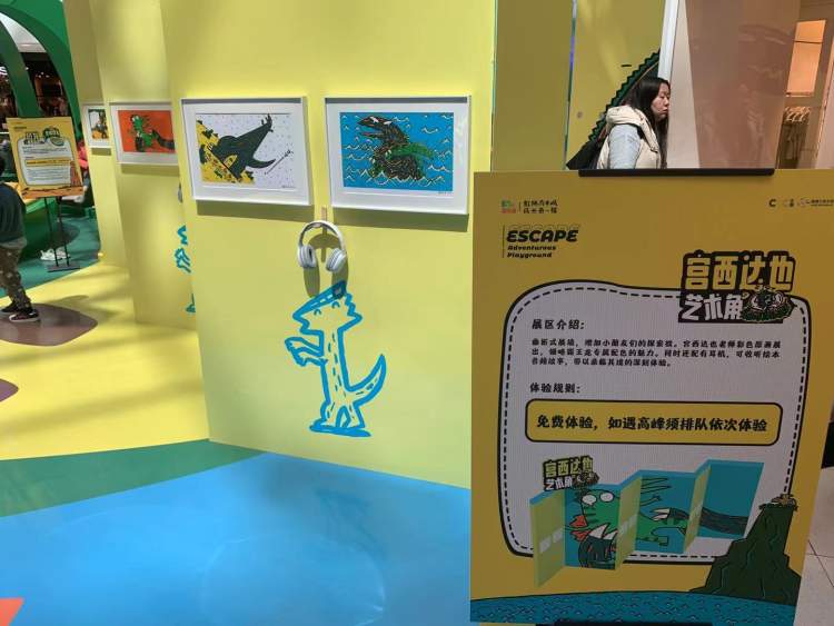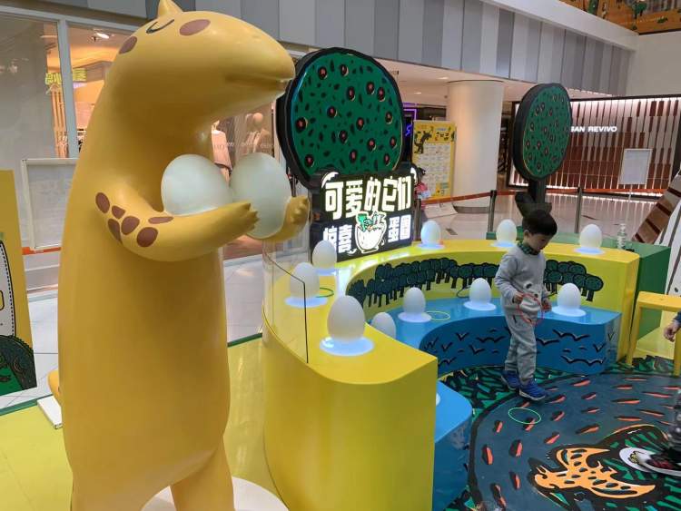 【惊喜蛋圈】站点其实就是我们很熟悉的“套圈”环节了。不过策展老师有提到,在设计时他们特别在一旁放置了一个慈母龙的形象,怀里还捧着两只恐龙蛋。因为在绘本故事中,慈母龙抚养的两个孩子中,一个是自己的孩子,还有一个便是霸王龙,“通过突出这样一个卡通形象,呼吁父母们能够更多的参与到与孩子共同阅读绘本的过程中。”