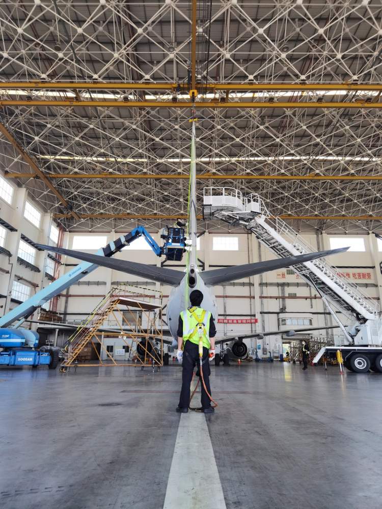 在这张现场实拍的图片中,东航机务维修人员正在进行787飞机发动机折流栅式反推折流门的结构探伤工作。