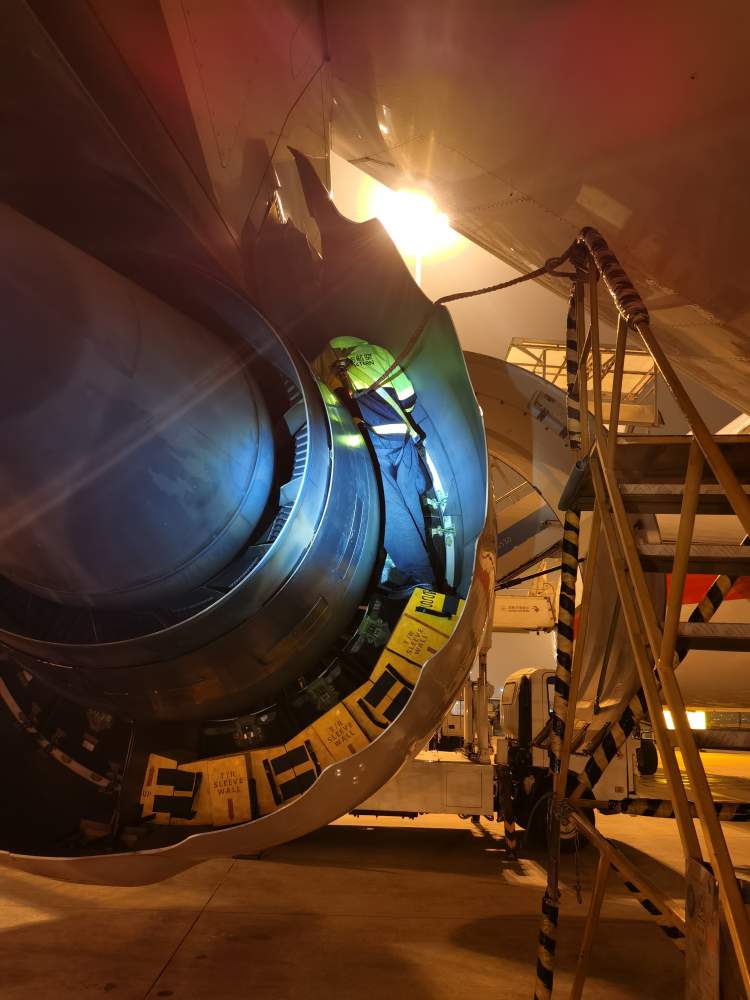 4月24日晚间,在东航技术公司虹桥维修基地,一架B787飞机的发动机探伤工作正在进行。在进行飞机发动机折流栅式反推折流门的结构探伤工作时,机务人员需要钻进狭窄局促的发动机外进气道中,用专门的探伤仪器对折流板的接耳结构进行高频涡流探伤检查,看是否存在损伤。