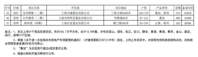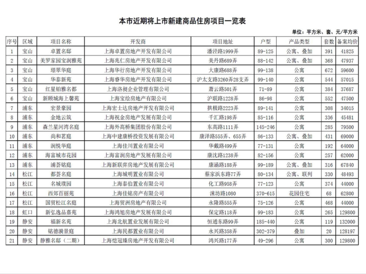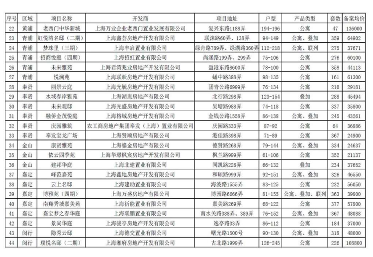 该批房源47个项目,总面积约156.7万平方米,共计13969套,分布在宝山、浦东、松江、虹口、静安、黄浦、青浦、奉贤、金山、嘉定、闵行、崇明等12个区域。这批房源中大部分为刚需盘,单套面积100平米以下的占比约三分之二,31个楼盘的备案均价为6万以下。该批房源中,一年内续盘项目27个,同类型房屋备案均价均未上涨。