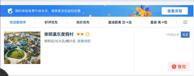 崇明最热门的酒店怡沁园度假村在网络预订平台上,从5月1日到3日的房间都已经售完,5月4日的房间较为紧张。此外,瀛东度假村、明珠湖度假村也出现个别时段在平台显示“售完”的情况。