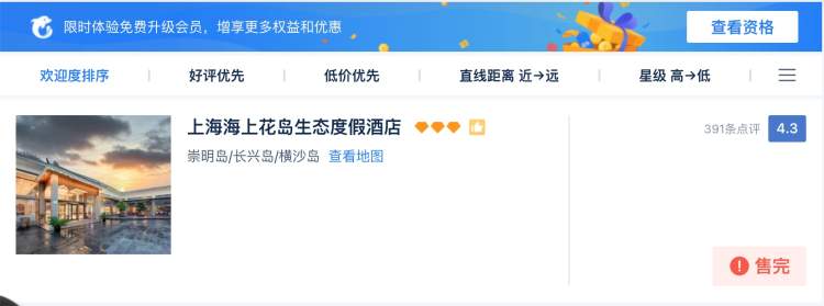 比如,距离花博会北园开车仅10来分钟车程的海上花岛生态度假酒店,5月20日晚、5月21日在携程和去哪儿平台显示“售完”。此外,崇明东部、距离花博园区1个多小时车程的瀛东度假村5月20日晚也显示“售完”。上述两个酒店预计多为团体预订。
