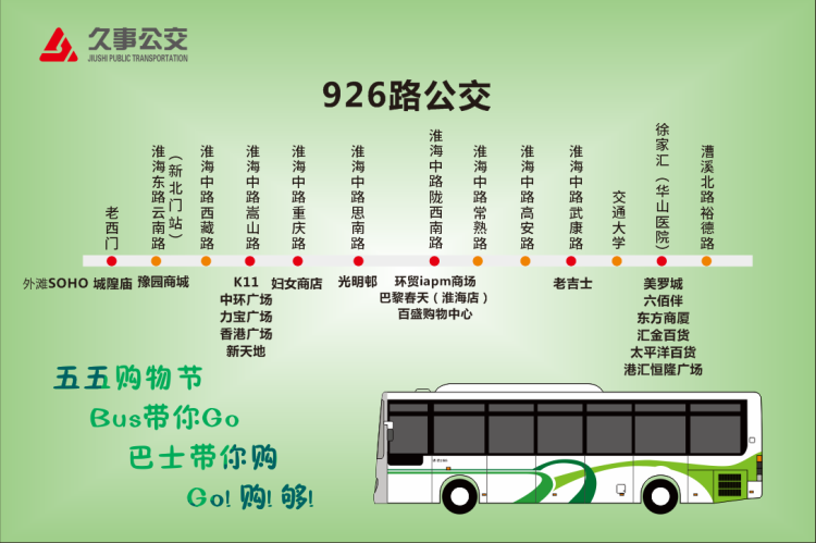 巴士四公司的双层巴士911路以及926路,都主要经过淮海路商业街。为了给广大乘客创造一个舒心的出行环境,展示窗口行业的良好形象,车队在各线路终点站配备了口罩、免洗洗手液等物品给市民游客使用,并在淮海路沿线911和926终点站发放55购物节助力小卡片,为市民和游客提供购物便利。