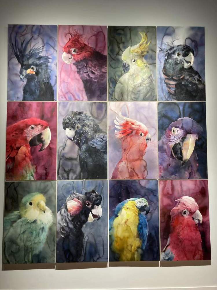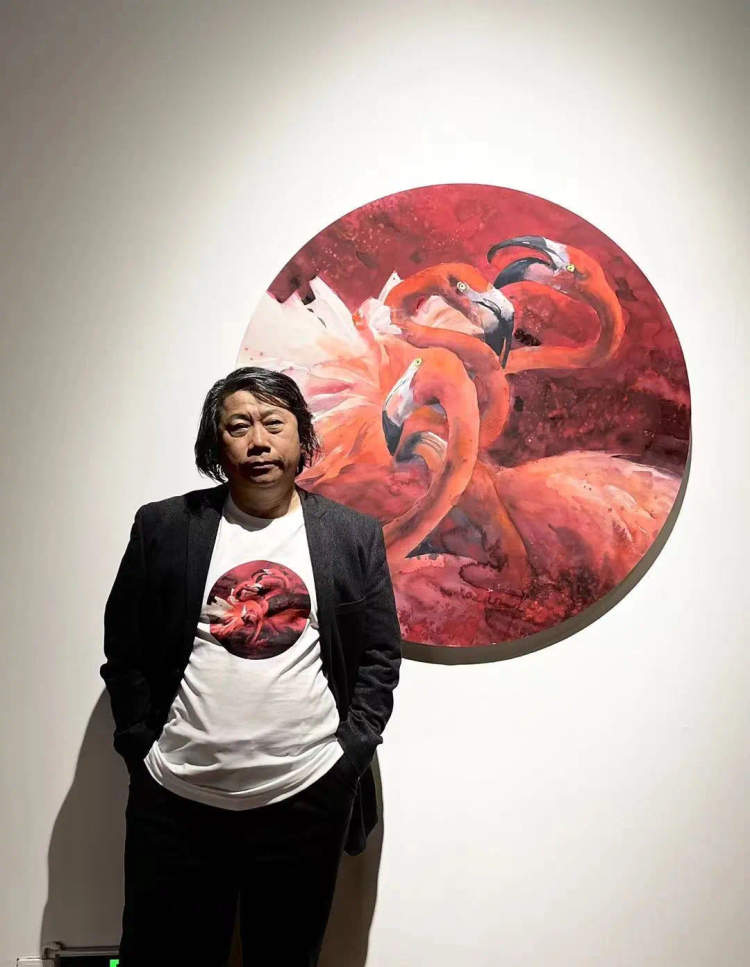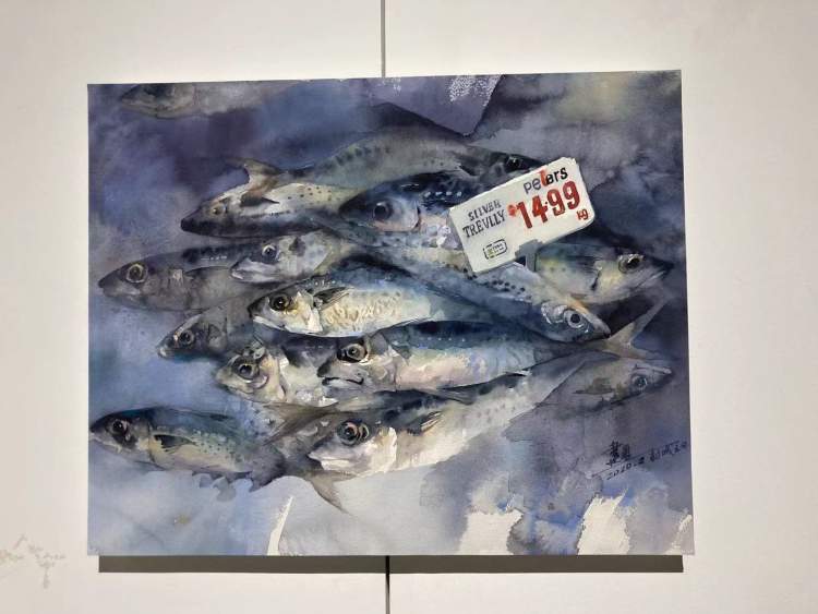 杨建勇画鱼摊上挣扎的鱼,眼神中充满顽强的生命痕迹,隐喻了绝境中万众生灵对生命的渴求;在杨建勇笔下,鹦鹉有着如同人类一般的表情,黑漆漆的眼睛里寓意着生命尊严,宛如一幅幅生命肖像;浴火重生的火烈鸟戴上并不合适的口罩,从荒诞中触发了对于人生意义的新思考。
