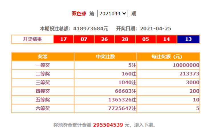 当期双色球头奖5注,广西5注,单注奖金为10000000元。计奖后,双色球奖池金额为2.95亿元。
