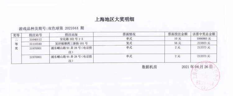 4月25日晚,中国福利彩票双色球游戏进行第2021044期开奖,红球号码为05、07、14、17、26、28,蓝球号码为13。数据显示,上海地区中得8注二等奖,单注奖金213373元。彩票分别售出于安化路302号1-3、吴泾镇塘湾三新街101号、浦东峨山路91弄28号(电话投注)福彩销售点。其中售出于安化路302号1-3福彩销售点的彩票为单式10元投注,奖金总额为1066865元。