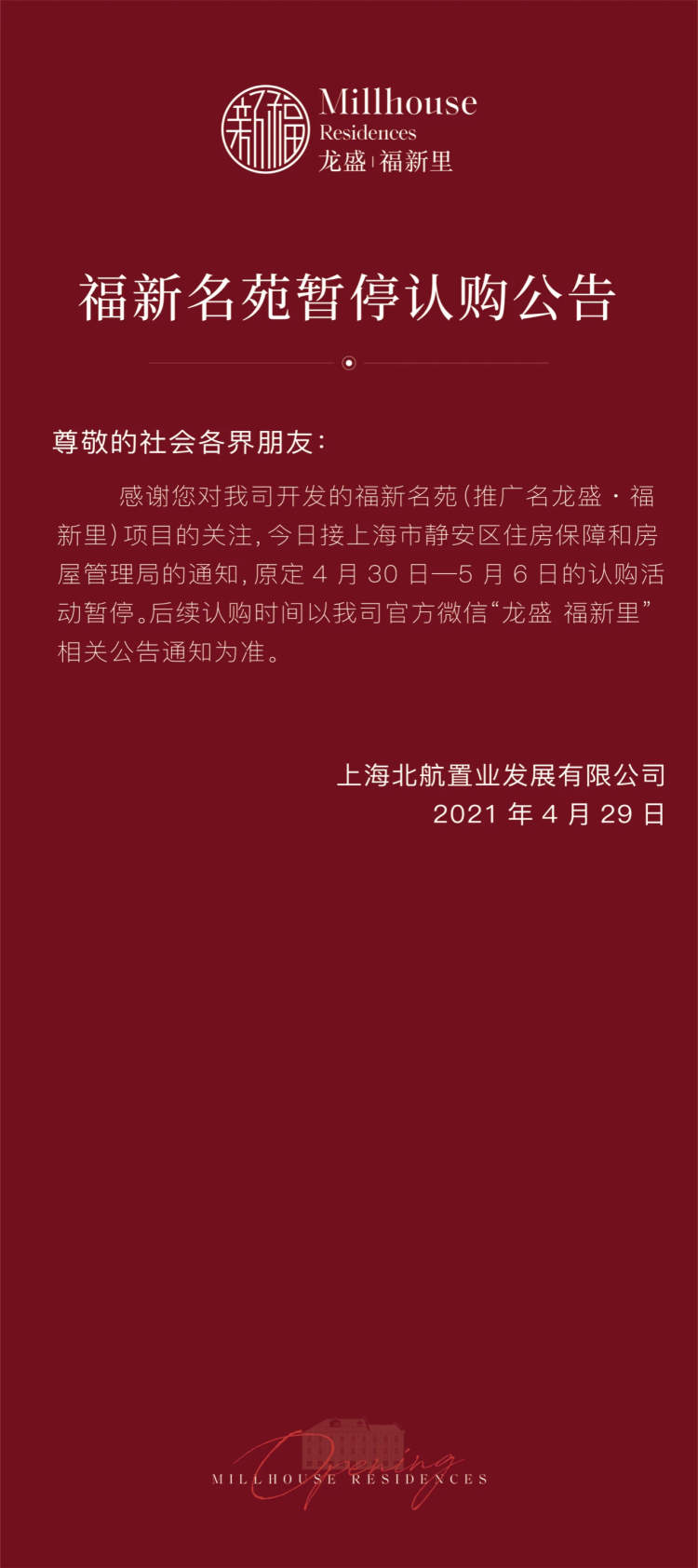 目前,福新名苑楼盘的认购已被叫停。静安区房管局将指导项目第一时间通知全体拟认购客户,做好解释说明。待项目完成整改,需要重新制定销售方案,报静安区房管局审批同意后方可销售。