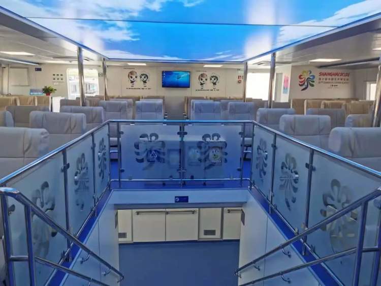 “新征程”号客船外表绘制了花博会吉祥物“圆圆”和“梦梦”,整体颜色艳丽活泼。客船还配有卫生间与服务台,环境舒适。