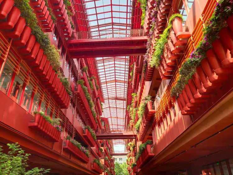 全景天幕屋顶设计、内街采用张扬的丹霞红、约2500个花钵构筑垂直绿化、绿植外立面随四季变化色彩……魔都打卡再添时尚新地标。