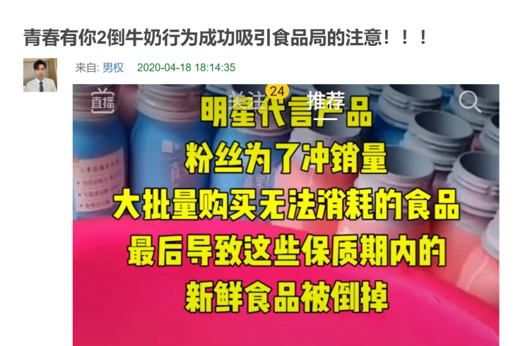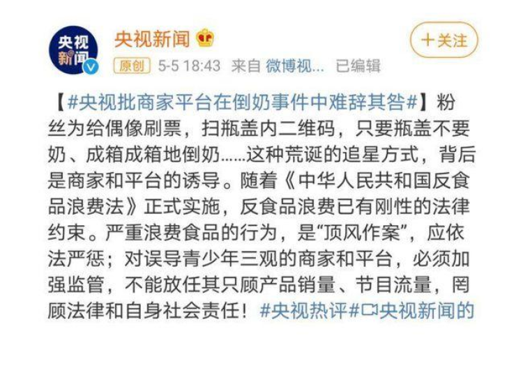 “这两天,一则倒牛奶的视频刺痛了很多人,起因是一档综艺节目的粉丝为了给偶像打榜投票,需要收集很多瓶盖,而开瓶之后喝不掉就雇人倒掉。”