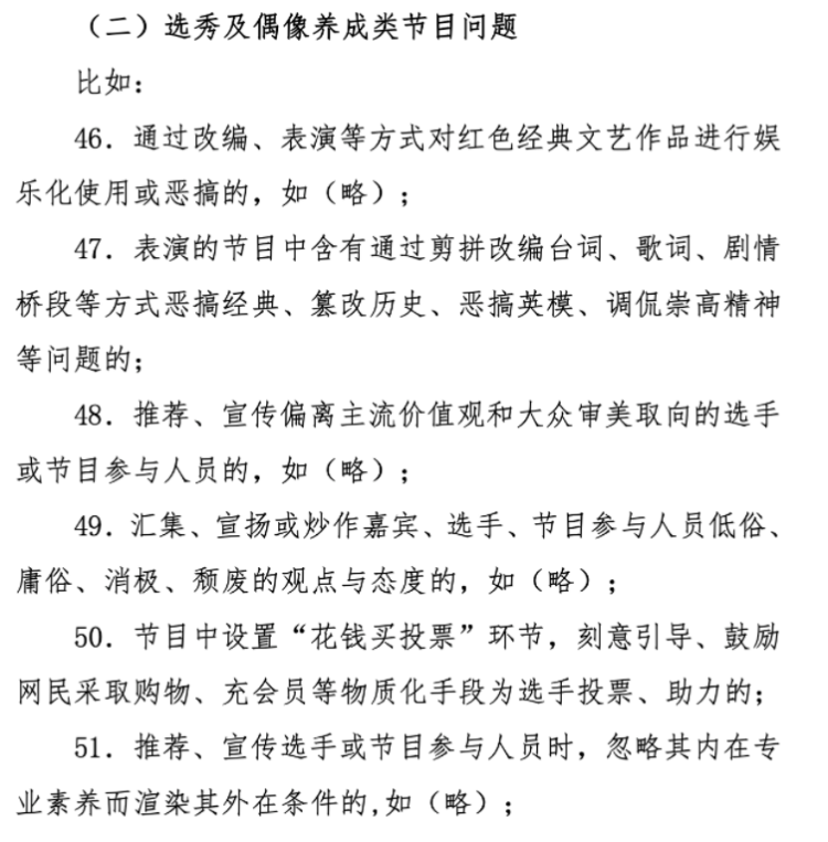 2020年2月,中国网络视听节目服务协会发布的《网络综艺节目内容审核标准细则》就明确规定,选秀及偶像养成类节目中不得出现设“花钱买投票”环节,不得刻意引导、鼓励网民采取购物、充会员等物质化手段为选手投票、助力。
